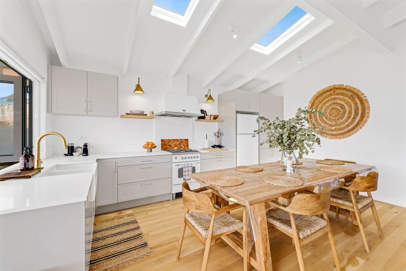 The heart of the home reveals a beautifully open-plan living space where coastal elegance meets relaxed functionality. The sun-drenched kitchen showcases premium appliances and ample storage, with feature skylights flooding the space with natural light. The kitchen flows seamlessly into the spacious dining and living areas, where soaring ceilings and a fresh, neutral palette create an atmosphere of easy beachside living. Split system air conditioning and ceiling fans ensure year-round comfort throughout the home.