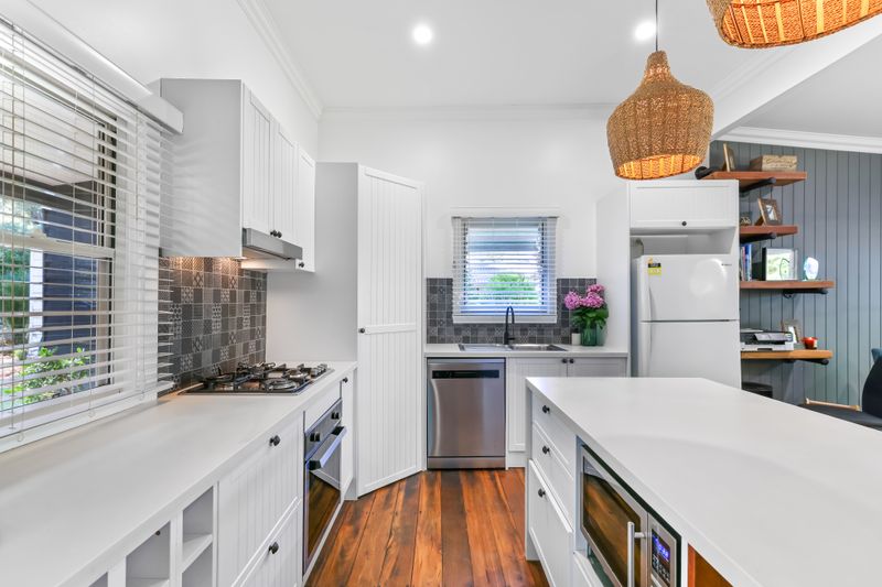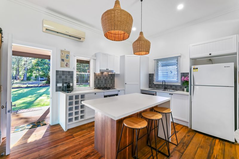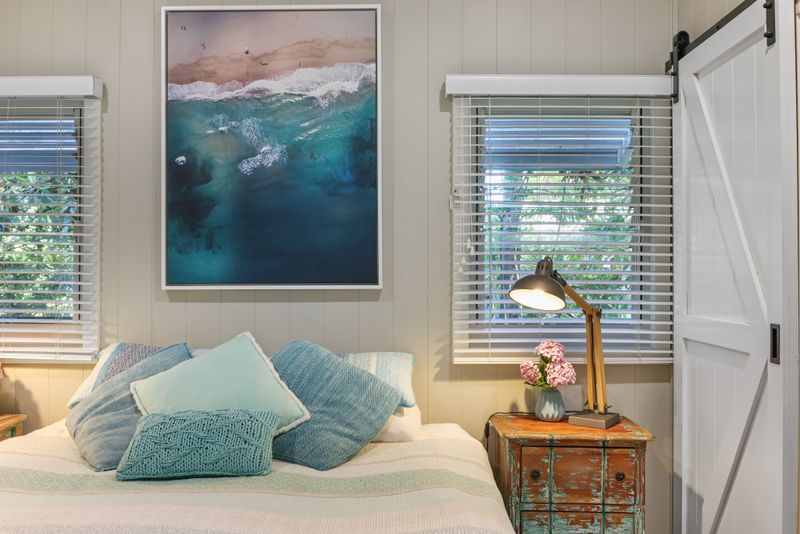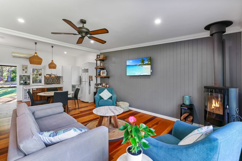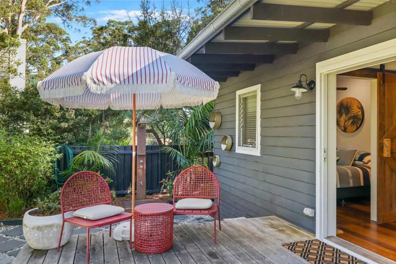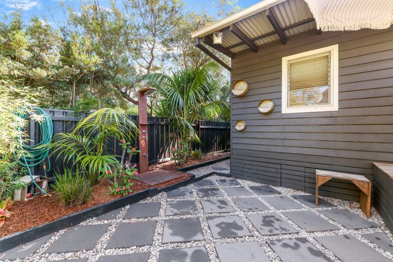 Three comfortable bedrooms including a large master, are serviced by a stylish bathroom, with an outdoor shower perfect for rinsing off after beach days. The open-plan kitchen, living and dining area features quality De'Longhi appliances, gas cooktop, fireplace and air conditioning. Charming barn doors crafted from the original flooring add warmth and character throughout.
