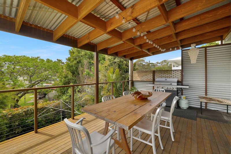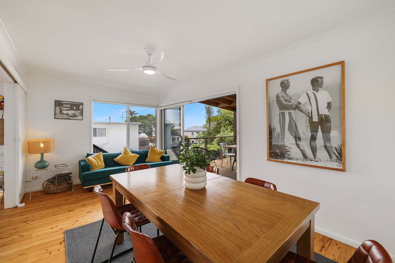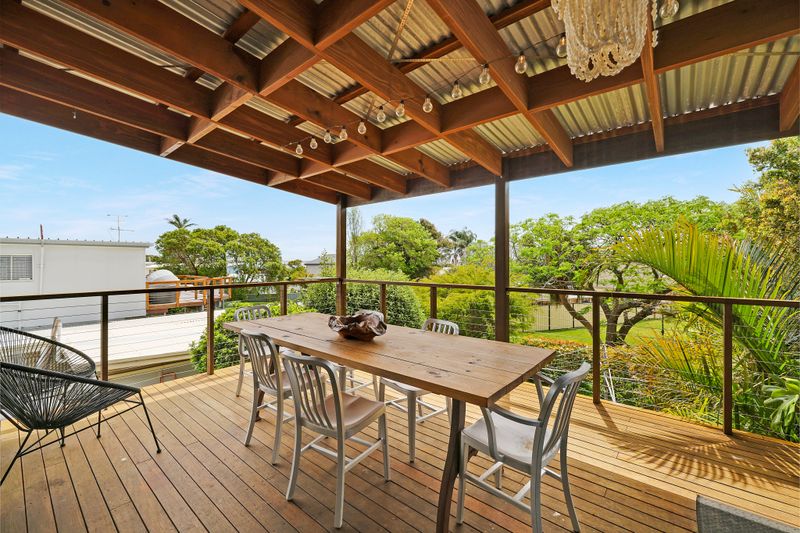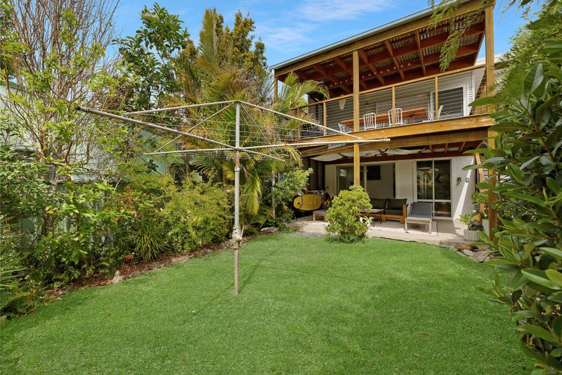 Upstairs, you'll find a light-filled kitchen and living area that flows through to an undercover deck overlooking the backyard - perfect for entertaining or enjoying a quiet morning coffee. This level also features two bedrooms, both with ceiling fans, and a main bathroom. Each of the bedrooms connects to a front balcony that captures the sea breeze.